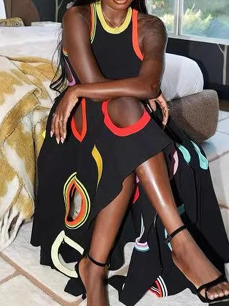 Women's Circle Hollow Out Tank Dress Round Neck Asymmetric Hem Pleated A-Line Casual Elegant Sleeveless High Street Sexy Dress